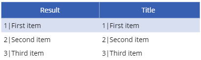 Please note that you don’t have a column header inside this table. It will just show as ‘Result’ because the Split() function doesn’t allow you to set a column header. If you do want to have a custom column header, you need to use the AddColumns() function to add another column to your table which has the same outcome as the Split() function: